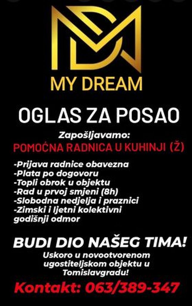 My Dream iz Tomislavgrada zapošljava pomoćnu radnicu u kuhinji.