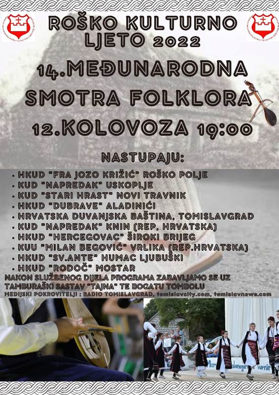 Naslovnica Kultura Najava: 14. Međunarodna smotra folklora u Roškom Polju KulturaObavijesti/ Najave Najava: 14. Međunarodna smotra folklora u Roškom Polju Objavio Admin - 12. kolovoza 2022. U petak, 12. kolovoza u Roškom Polju održat će se 14. Međunarodna smotra folklora. Program počinje u 19 sati. Detaljnije informacije na plakatu. Svi ste dobro došli! VEZANI ČLANCIVIŠE OD AUTORA Zemljo progovori (U spomen na sve nestale u Domovinskom ratu) Predstavljanje zbirke pjesama „Odškrinuta didovina“ i filma „Etno baština – Odškrinuta didovina“ autora Ante Lišnića Potražuje se građevinsko zemljište za izgradnju obiteljske kuće u Tomislavgradu Županijski zavod za upošljavanje Livno započeo s obukama iz poslovne pismenosti 18. studenoga 2025. 34 godine od tragedije: Vukovar odaje počast braniteljima i civilima Domovinskog... 18. studenoga 2025. MUP HBŽ: Svaka zloupotreba oružja ili neodgovorno ponašanje može imati tragične... 18. studenoga 2025. Ministar Tadić održao sastanak s ravnateljima predškolskih ustanova u Hercegbosanskoj županiji 18. studenoga 2025. Mogući privremeni prekidi vodoopskrbe na području Šujice 18. studenoga 2025.