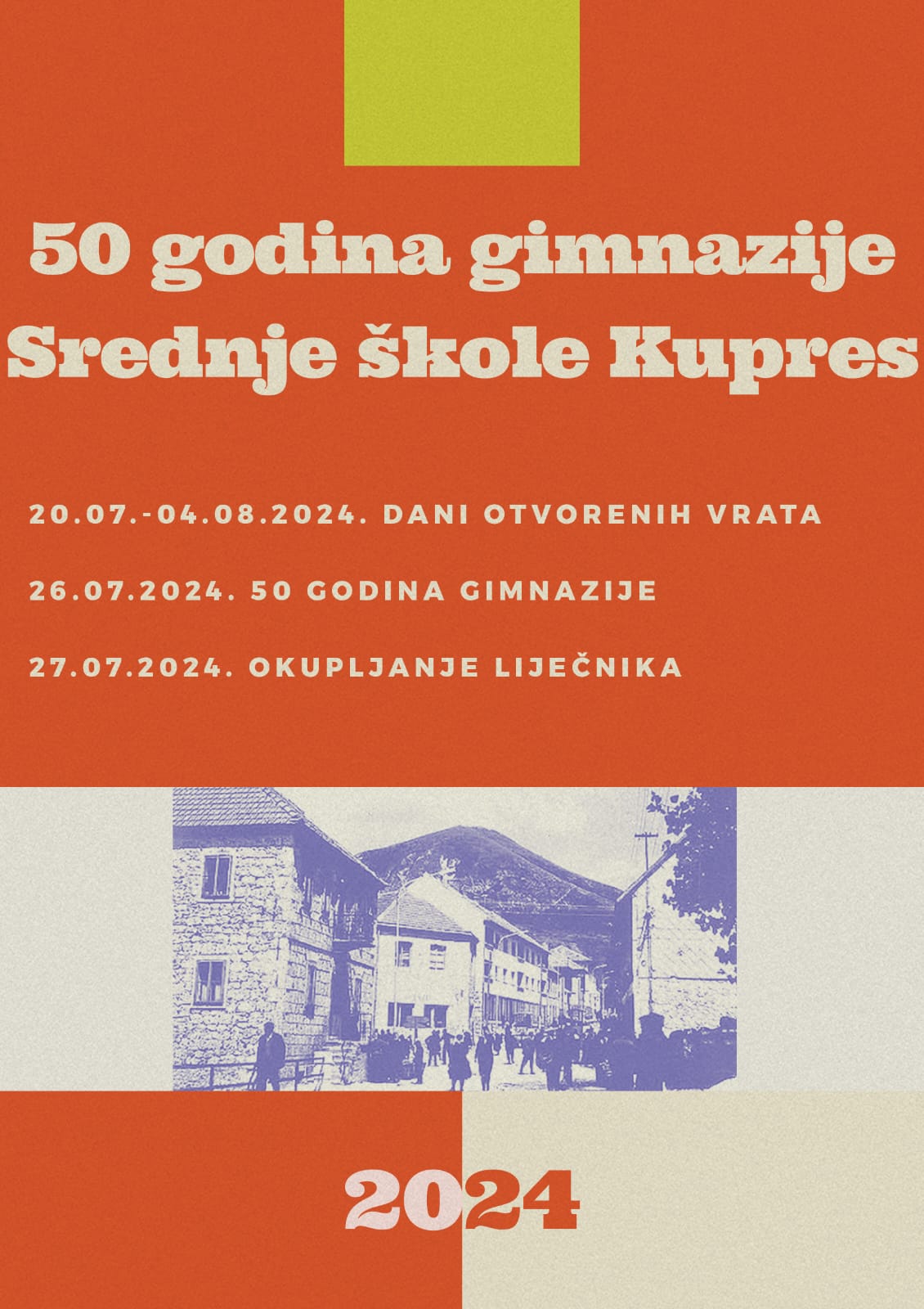 Tim povodom, od 20. srpnja do 4. kolovoza na Kupresu će se održati dani otvorenih vrata gimnazije i srednje škole; u petak 26. srpnja održat će se središnja proslava 50. obljetnice, a dan kasnije – u subotu 27. srpnja bit će okupljanje liječnika, koji su prema svojim karijerama krenuli iz kupreških klupa.