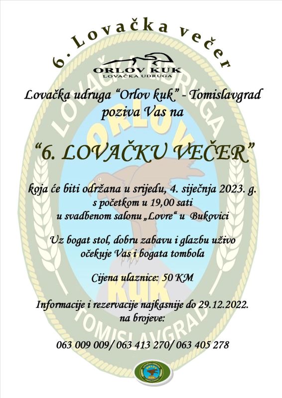 - po redu lovačka večer Lovačke udruge “Orlov kuk” – Tomislavgrad će biti održana 4. siječnja 2023. s početkom u 19,00 sati u svadbenome salonu “Lovre” u Bukovici!