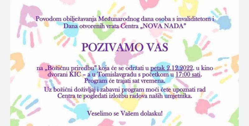Povodom obilježavanja Međunarodnoga dana osoba s invaliditetom i Dana otvorenih vrata, Centar “Nova nada” poziva na “Božićnu predstavu” koja će se održati u petak, 2. prosinca u kinodvorani KIC-a s početkom u 17 sati.