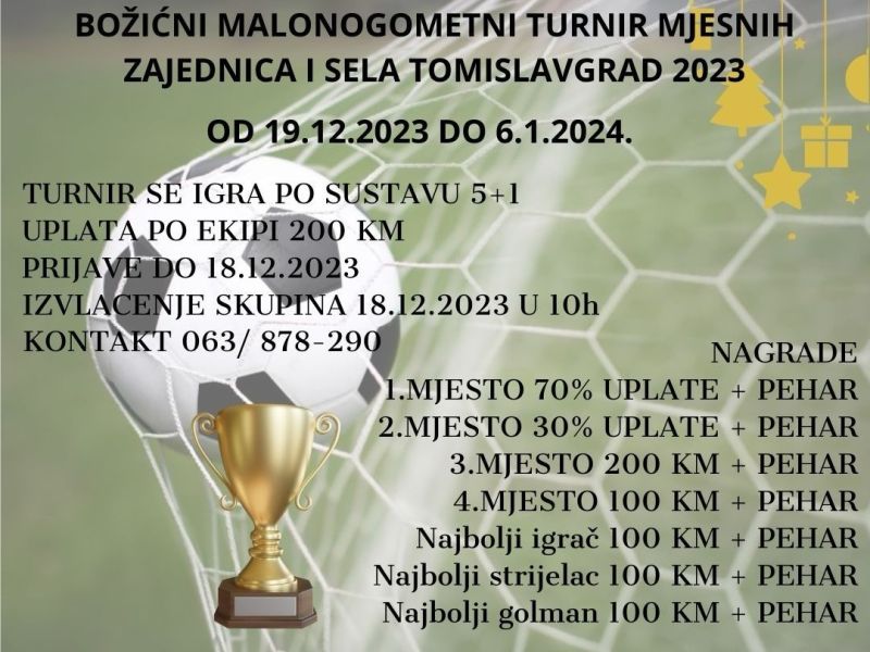 Božićni malonogometni turnir mjesnih zajednica i sela Tomislavgrad 2023. bit će održan od 19. prosinca do 6. siječnja.