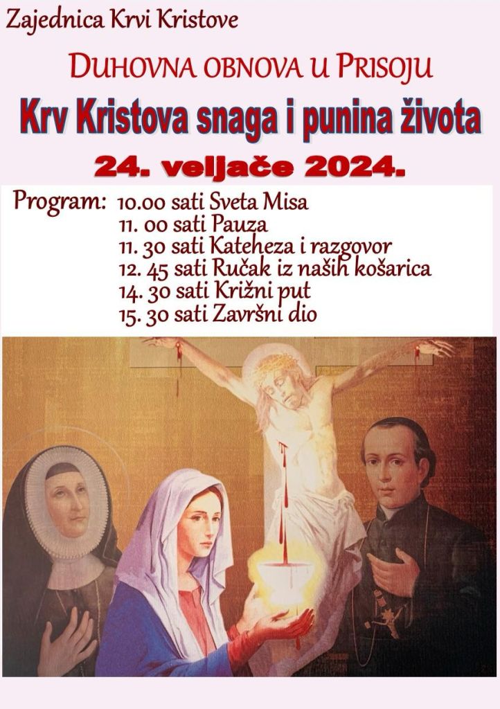 Zajednica Krvi Kristove organizira duhovnu obnovu u Prisoju na temu: Krv Kristova snaga i punina života.