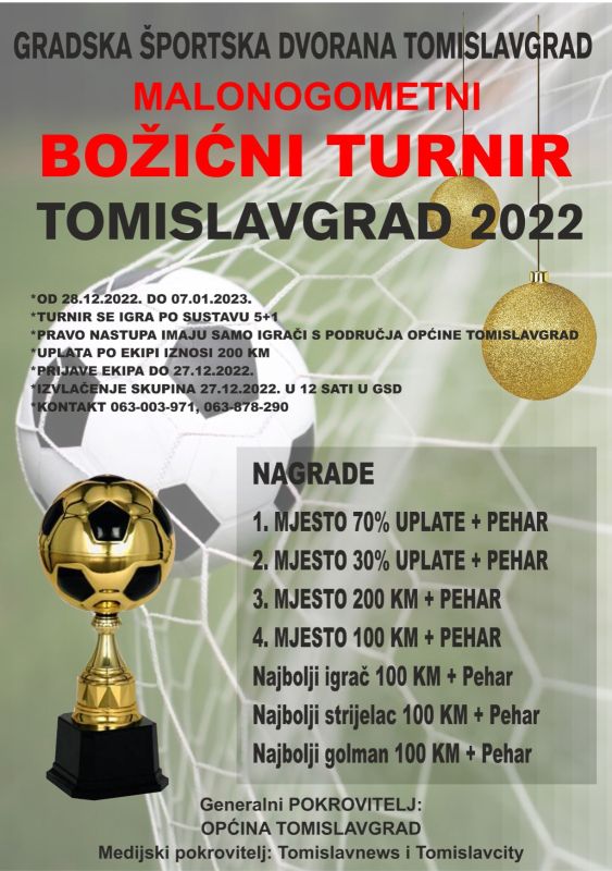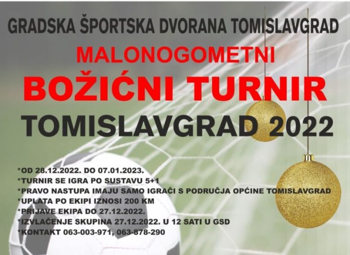 U Gradskoj sportskoj dvorani u Tomislavgradu i ove godine bit će održan tradicionalni “Malonogometni božićni turnir”. Turnir počinje 28. prosinca, a pravo nastupa imaju samo igrači s područja općine Tomislavgrad. Prijave su do 27. prosinca a uplata po ekipi iznosi 200 KM. Izvlačenje skupina predviđeno je 27. prosinca u 12 sati u Gradskoj sportskoj dvorani u Tomislavgradu.