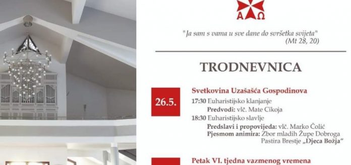 Na svetkovinu Uzašašća Gospodinova u župi Dobroga Pastira, Zagreb-Brestje, svoju mladu misu predslavit će vlč. Mate Cikoja pod geslom “Ja sam s vama u sve dane do svršetka svijeta” (Mt 28,20)