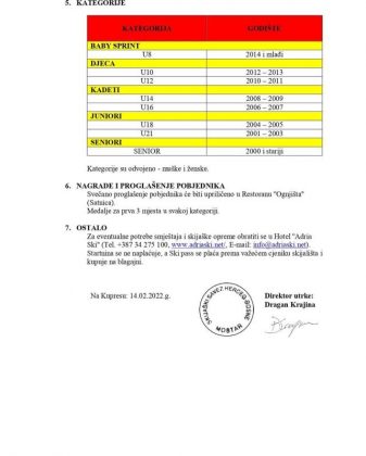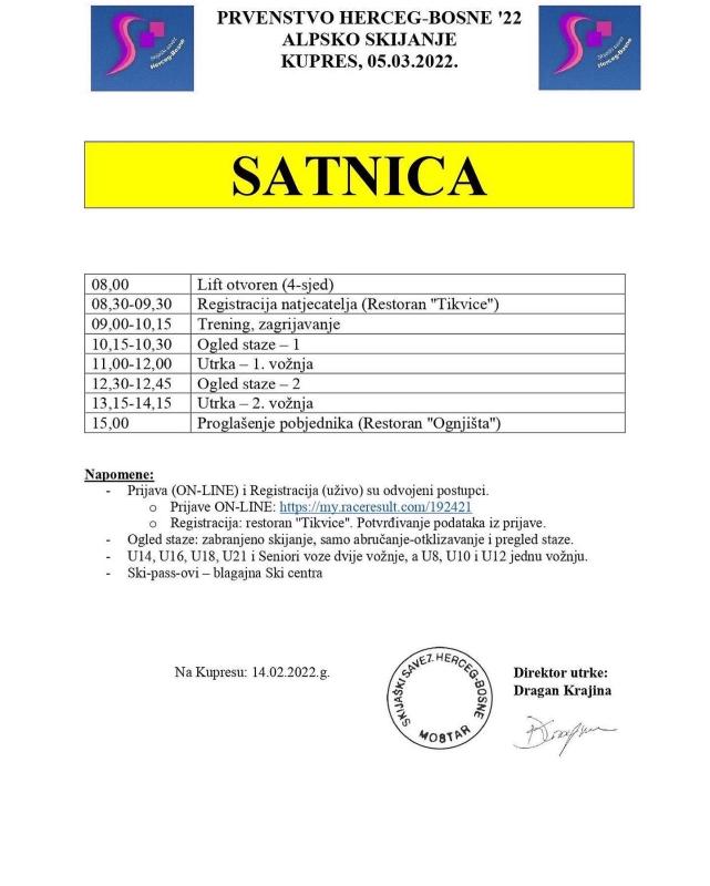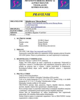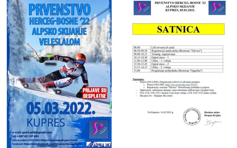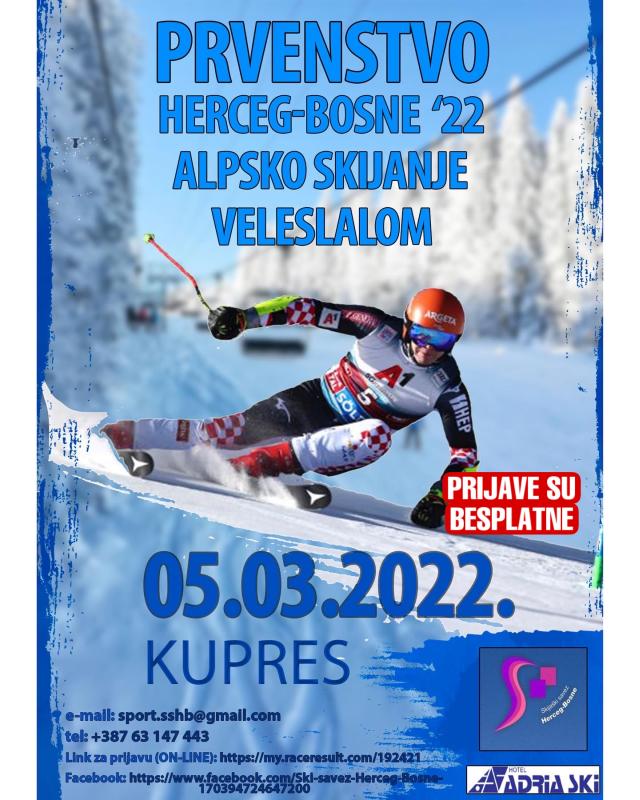 Prvenstvo u disciplini veleslalom održat će se 5. ožujka 2022. na skijalištu Čajuša u općini Kupres.