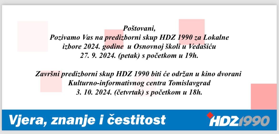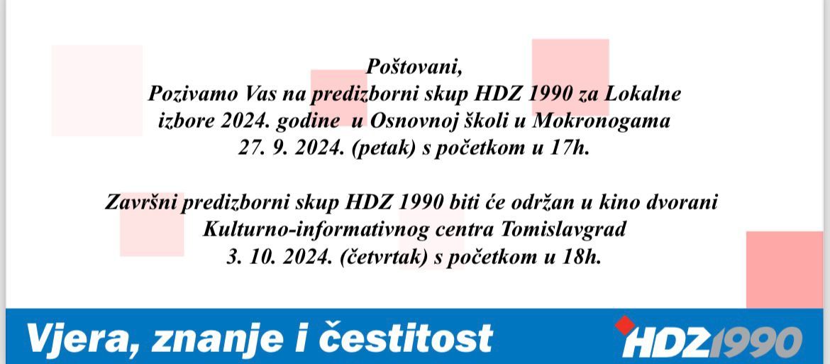 Naslovnica Izbori 2024. Najava predizbornih skupova HDZ 1990 u Mokronogama i Vedašiću Izbori 2024. Najava predizbornih skupova HDZ 1990 u Mokronogama i Vedašiću Objavio TCity - 27. rujna 2024. HDZ 1990 Tomislavgrad najavljuje predizborne skupove u Mokronogama i Vedašiću. Izbori 2024. - Sponzorirani sadržaj VEZANI ČLANCIVIŠE OD AUTORA Ante Ćurić iz HDZ 1990 novi predsjednik Općinskog vijeća Tomislavgrad Dr. Josip Perić: Povratak na čelo OO HDZ-a Tomislavgrad je čista izmišljotina Tomislav Krišto zahvalio biračima i čestitao načelniku Ivanu Buntiću Matica hrvatska Travnik ustanovljuje nagradu „Ivo Andrić“ 17. travnja 2026. Učenici Srednje glazbene škole Tomislavgrad briljirali na Federalnom natjecanju u Srebreniku 17. travnja 2026. U Livnu će se graditi nova bolnica, investicija vrijedna 48 milijuna... 17. travnja 2026. Ovo su iznosi minimalnih mirovina u FBiH za umirovljenike s 40,... 17. travnja 2026. Memorijal „fra Stjepan Petar Krasić“ i specijalna izložba tornjaka „Kup kralja... 17. travnja 2026.