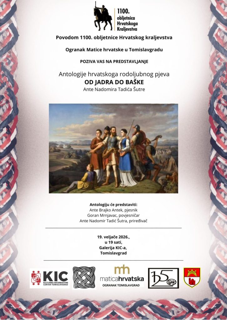 Ogranak Matice hrvatske u Tomislavgradu poziva na predstavljanje Antologije hrvatskog rodoljubnog pjeva “OD JADRA DO BAŠKE” priređivača Ante Nadomira Tadića Šutre, a kojoj je nakladnik Ogranak Matice hrvatske u Tomislavgradu uz Kninski muzej i Društvo hrvatskih književnika – ogranak Split.