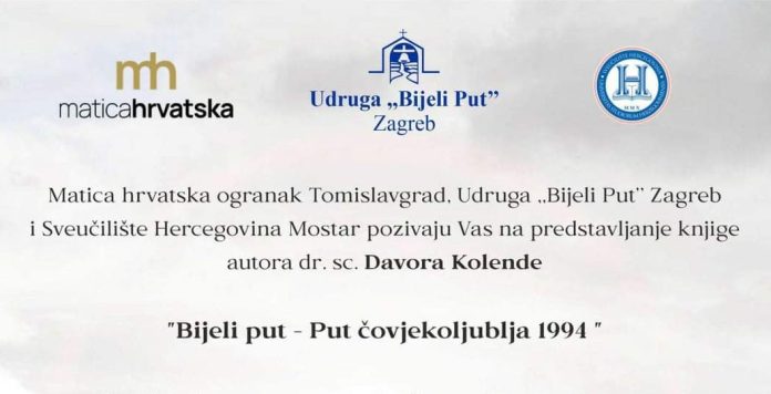 Knjiga pod nazivom „Bijeli put – Put čovjekoljublja 1994“ duvanjskoj javnosti bit će predstavljena u petak, 28. lipnja u Skupštini Hercegbosanske županije u Tomislavgradu s početkom u 19 sati.