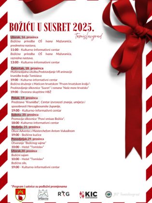 I ove godine adventsko vrijeme u Tomislavgradu bit će ispunjeno molitvom, pjesmom i prigodnim priredbama. Općina Tomislavgrad zajedno s Turističkom zajednicom, Kulturno-informativnim centrom, Radiom Tomislavgrad i JKP Tomislavgrad organizira tradicionalnu manifestaciju ”Božiću u susret” koja će trajati od 3. do 30. prosinca 2025. godine.