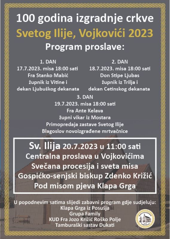 Na sv. Iliju, u četvrtak, 20. srpnja u 11 sati održat će se središnja proslava obilježavanja 100 godina od izgradnje crkve sv. ilije u Vojkovićima.
