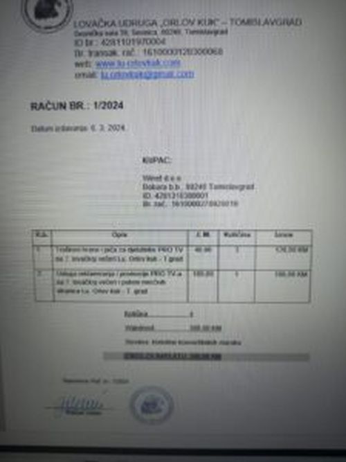 Prva stavka u iznosu je 120 KM, u kojoj su navedeni troškovi jela i pića za PRO TV, a druga od 180 KM za uslugu reklamiranja i promociju televizije.
