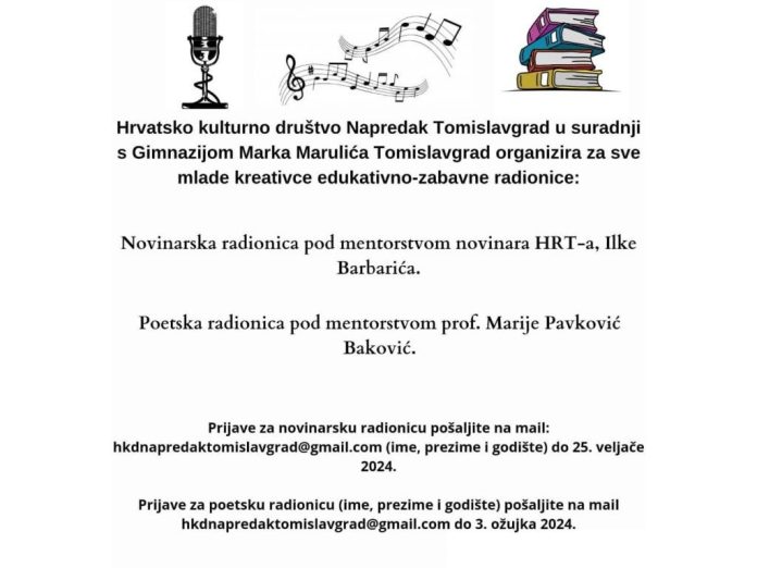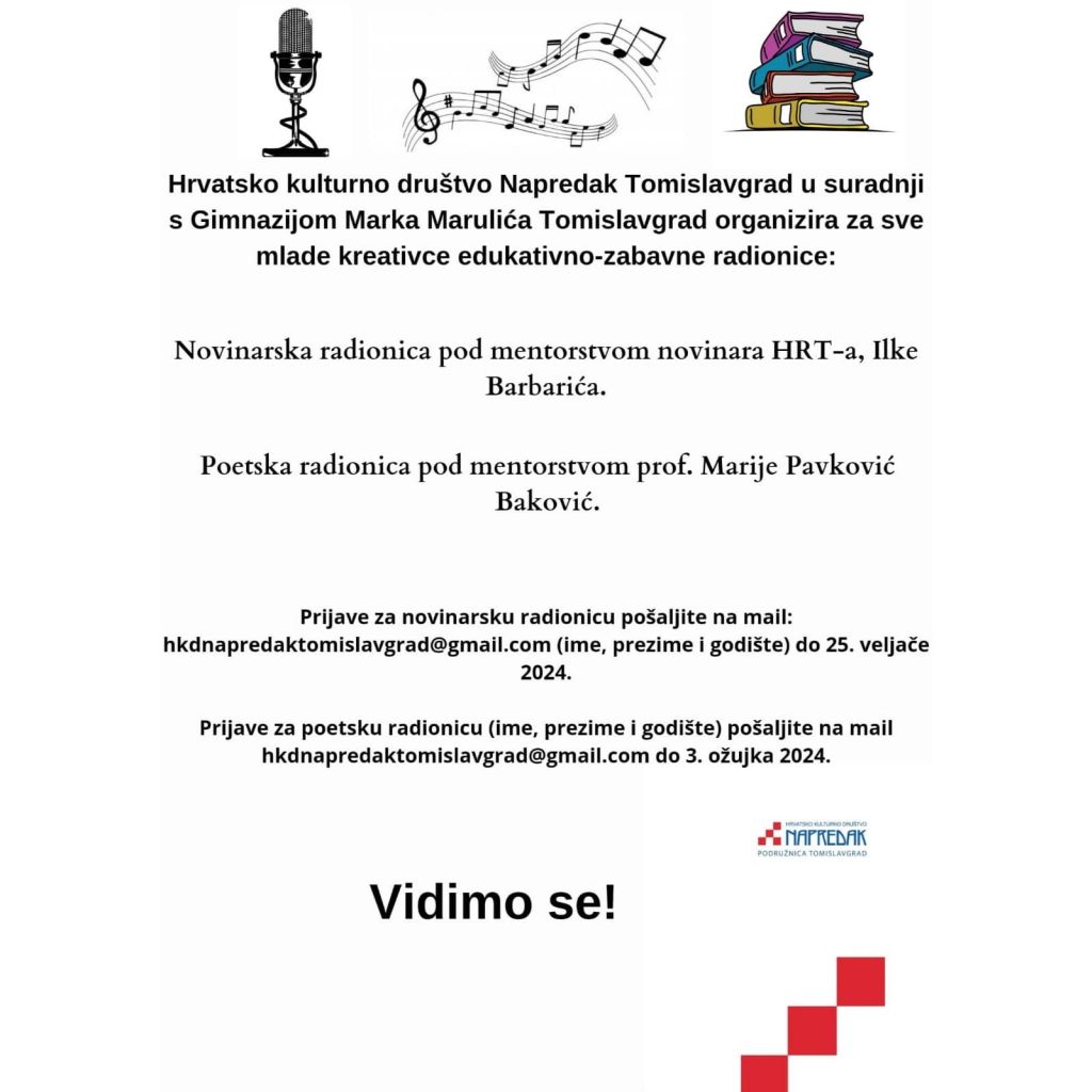 Hrvatsko kulturno društvo Napredak Tomislavgrad u suradnji s Gimnazijom Marka Marulića Tomislavgrad organizira za sve mlade kreativce edukativno-zabavne radionice: