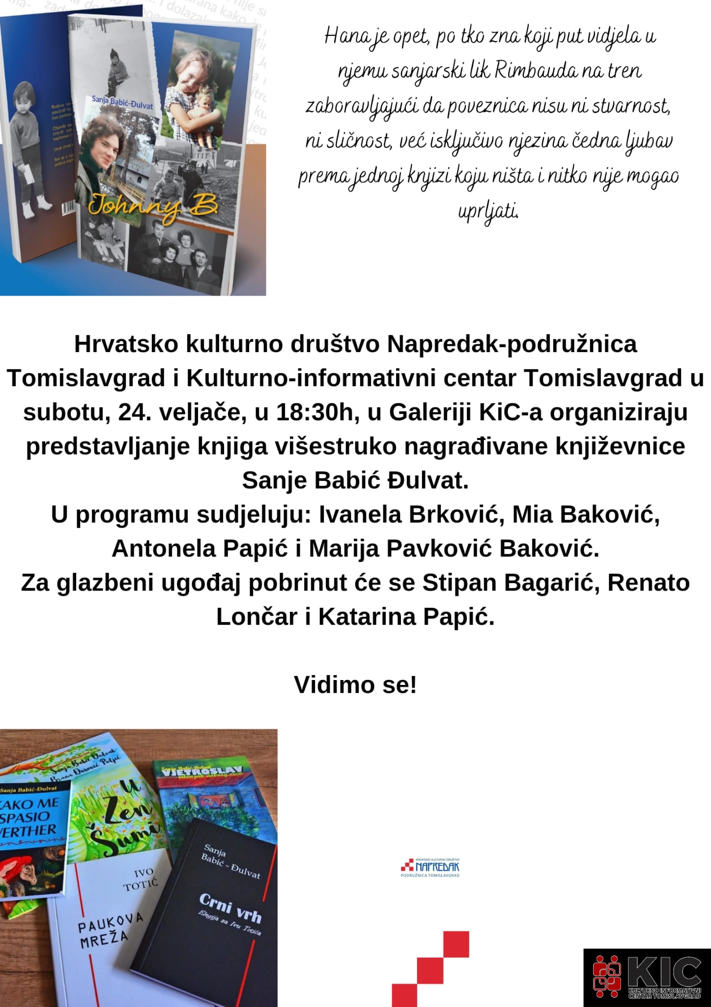 Napredak pak u suradnji s KIC-om organizira predstavljanje knjiga višestruko nagrađivane književnice Sanje Babić Đulvat. Promocija će biti 24. veljače u 18.30 u tomislavgradskoj Galeriji KIC-a.