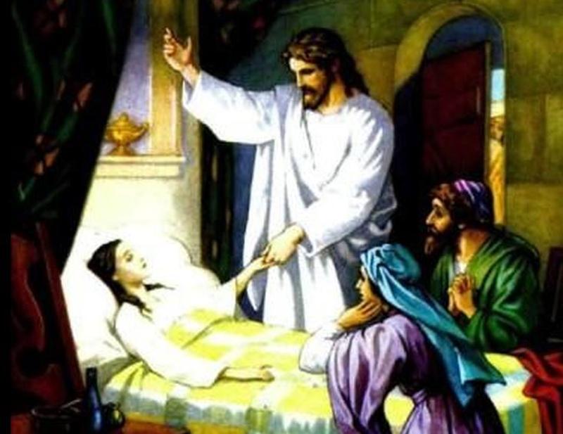 Potom je Isus odmah žurno krenuo prema nadstojnikovoj kući s Petrom, te dvojicom braće Jakovom i Ivanom, a drugima nikome nije dopustio. I došavši u Jairovu kuću, zatekli su osobe u buci i glasnom plaču i naricanju. Tada im je rekao da prestanu s tom bukom, plačem i naricanjem jer djevojčica nije umrla nego zaspala i spava. Nazočni su mu se smijali misleći kako prebrzo zaključuje o njezinu sveukupnom stanju sa zdravljem tijela i sa stanjem duha.