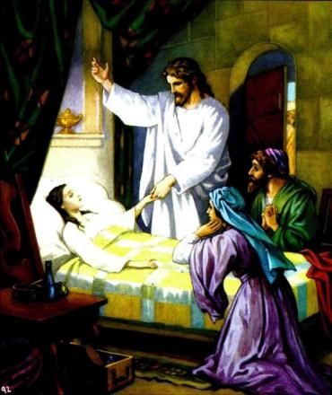 Istjeravši ih sve iz sobe (teško je prihvatiti da ih je izbacivao kao ono u Hramu), gdje je bila djevojčica, a potom uđe k njoj s njezinim ocem Jairom i njezinom majkom, te sa svojim pratiocima. Uze je za ruku govoreći: “Talita, kum!“ A ta rečenica znači: “Djevojko! Zapovijedam ti, ustani!“ I ona odmah ustade, te poče hodati. Svi nazočni s čuđenjem su sve motrili i ostali su zadivljeni ovim događajem. Isus im je rekao da o ovome ništa ne pripovijedaju, jer ne želi senzaciju, te zapovjedi da djevojci dadnu jesti kako bi se malo okrijepila i živnula za daljnji ovozemni oblik života.