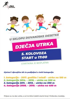 Kao uvod u glavni događaj pripremili smo i Dječju utrku koja počinje u 17:00. Klinci će biti raspoređeni po starosnim kategorijama, a trčat će na četiri distance: 100, 200, 300 i 400 m. Svi će dobiti dječju finišersku medalju. Prijave za ovu utrku bit će na sam dan manifestacije te je startnina za ovu utrku besplatna.