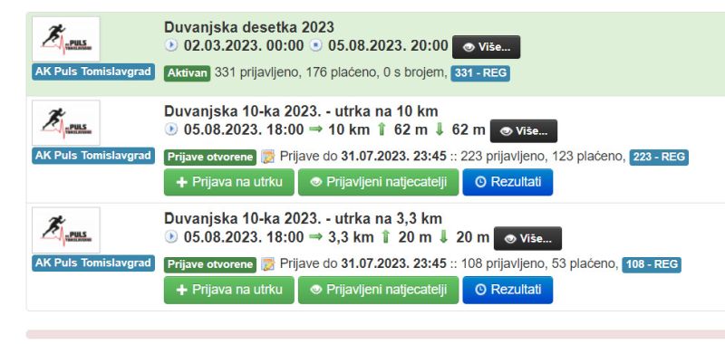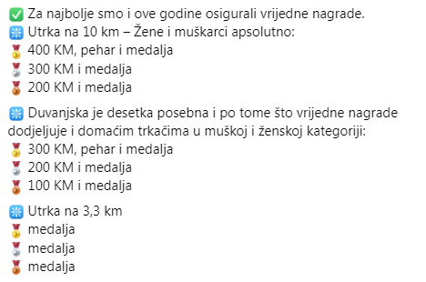 Do sada imamo više od 300 prijavljenih, a prijave za Duvanjsku desetku i Utrku građana dostupne su do 31. 7. 2023. – 23:45 te se po isteku prijavnog roka više neće biti moguće prijaviti! Startnina za Utrku na 10 km iznosi 30 KM, a startnina za Utrku građana 15 KM te se uplaćuje do isteka prijavnog roka na primatelja AK Puls Tomislavgrad, UniCredit bank: 33823 02273 571220, Opis plaćanja: Ime i prezime + kategorija (10 km ili 3,3 km).