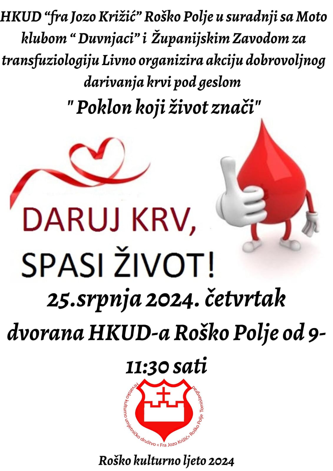 U sklopu ovogodišnjeg Roškog kulturnog ljeta, HKUD “fra Jozo Križić Roško Polje” u suradnji s Moto klubom “Duvnjaci” i Županijskim zavodom za transfuziologiju Livno sutra, 25. srpnja organizira akciju dobrovoljnog darivanja krvi.