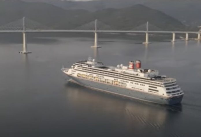 Ispod Pelješkog mosta, koji još nije otvoren za promet, prošlog tjedna je prošao prvi kruzer od dovršetka izgradnje.