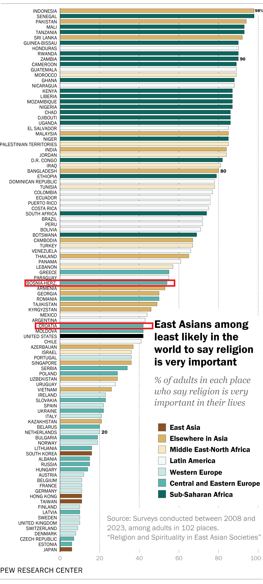 Što se tiče Hrvatske te Bosne i Hercegovine, među 102 zemlje obuhvaćene analizom, one se nalaze oko sredine ljestvice, premda u njenom donjem domu. Nešto više od 40% ispitanih u Hrvatskoj religiju smatra vrlo važnom, dok je u BiH taj postotak nešto viši i prelazi polovicu stanovništva.