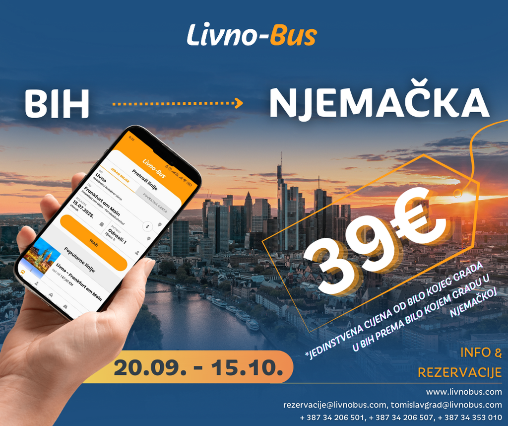 Livno-Bus od 20. rujna do 15. listopada ima posebnu akciju. Jedinstvena cijena od bilo kojega grada u BiH prema bilo kojem gradu u Njemačkoj za 39€.