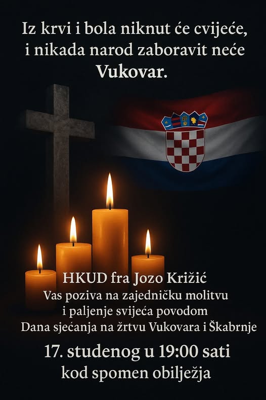 HKUD „Fra Jozo Križić“ Roško Polje u ponedjeljak, 17. studenoga, kod Spomen-obilježja poginulim braniteljima organizira molitvu, prigodni program i paljenje svijeća za žrtve Vukovara i Škabrnje.