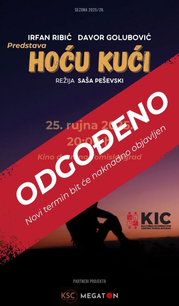 Iz Kulturno-informativnog centra Tomislavgrad obavještavaju javnost da je kazališna predstava “Hoću kući”, koja je bila najavljena za večeras, odgođena. Novi termin izvedbe bit će naknadno objavljen.