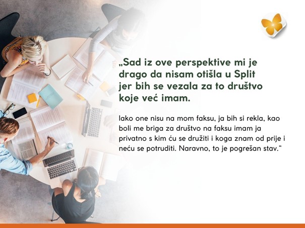 „Sad iz ove perspektive mi je drago da nisam otišla u Split jer bih se vezala za to društvo koje već imam. Iako one nisu na mom faksu, ja bih si rekla, kao boli me briga za društvo na faksu imam ja privatno s kim ću se družiti i koga znam od prije i neću se potruditi. Naravno, to je pogrešan stav.“