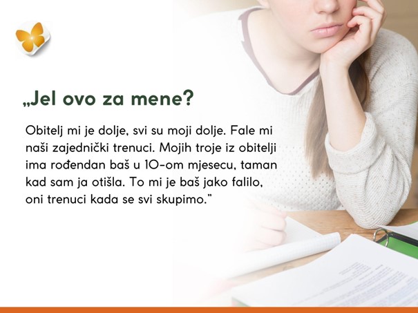 „Jel ovo za mene? Obitelj mi je dolje, svi su moji dolje. Fale mi naši zajednički trenuci. Mojih troje iz obitelji ima rođendan baš u 10-om mjesecu, taman kad sam ja otišla. To mi je baš jako falilo, oni trenuci kada se svi skupimo.