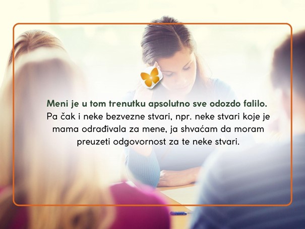 „Imaš ti ljude na faksu koji dolaze sami na faks, sami sjede, sami jedu. Ne znam je li do njih, ili nisu uspjeli nikog upoznati. Ja recimo ne bih mogla biti sama tako. Možda su to ljudi koji su iz Zagreba, dolaze na faks da to odrade a privatno imaju svoje društvo. Valjda ti je lakše da kad si na faksu povezati se s ljudima pa ako ti nešto zatreba možeš pitati za pomoć a možeš i ti pomoći. I što mi je čudno, na četvrtoj godini.., ajde na prvoj tek si došao.“