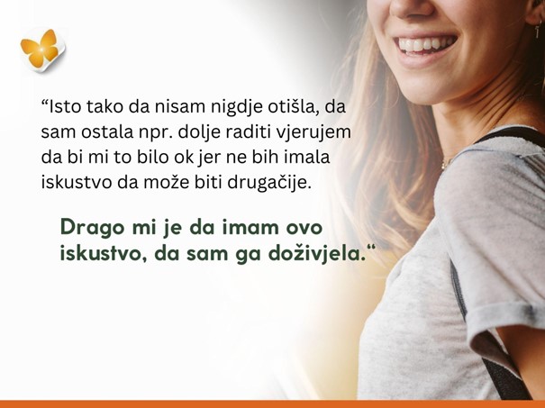 Isto tako da nisam nigdje otišla, da sam ostala npr. dolje raditi vjerujem da bi mi to bilo ok jer ne bih imala iskustvo d a može biti drugačije. Drago mi je da imam ovo iskustvo, da sam ga doživjela.“