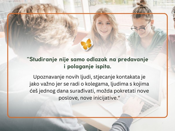 Također, studiranje nije samo odlazak na predavanje i polaganje ispita. Upoznavanje novih ljudi, stjecanje kontakata je jako važno jer se radi o kolegama, ljudima s kojima ćeš jednog dana surađivati, možda pokretati nove poslove, nove inicijative.“