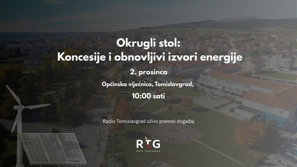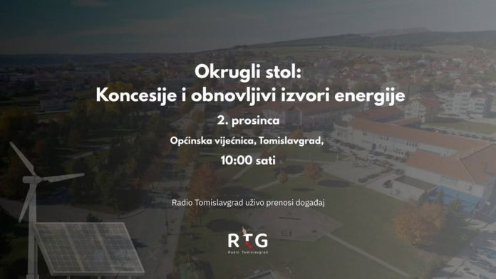 Radio Tomislavgrad najavljuje okrugli stol na temu “Koncesije i obnovljivi izvori energije”, koji će se održati u utorak, 2. prosinca, u općinskoj vijećnici, uz izravni radijski prijenos od 10 sati. Riječ je o aktualnoj i važnoj temi ne samo u općini Tomislavgrad već i u Hercegbosanskoj županiji.