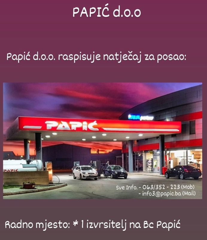 Papić d.o.o. traži radnika za rad na benzinskoj crpki u Tomislavgradu.