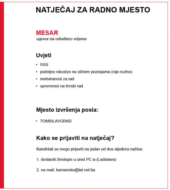 - poslati životopis na mail: kamensko@tel.net.ba