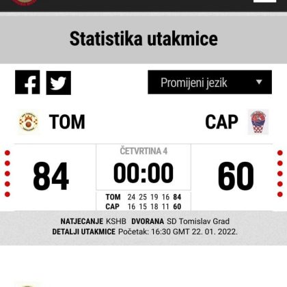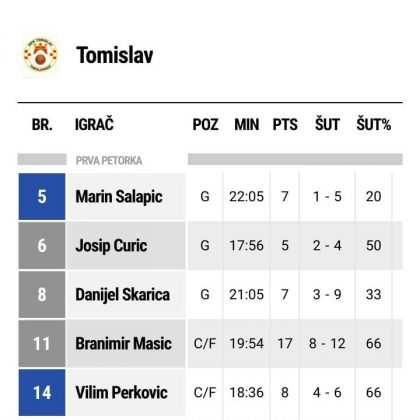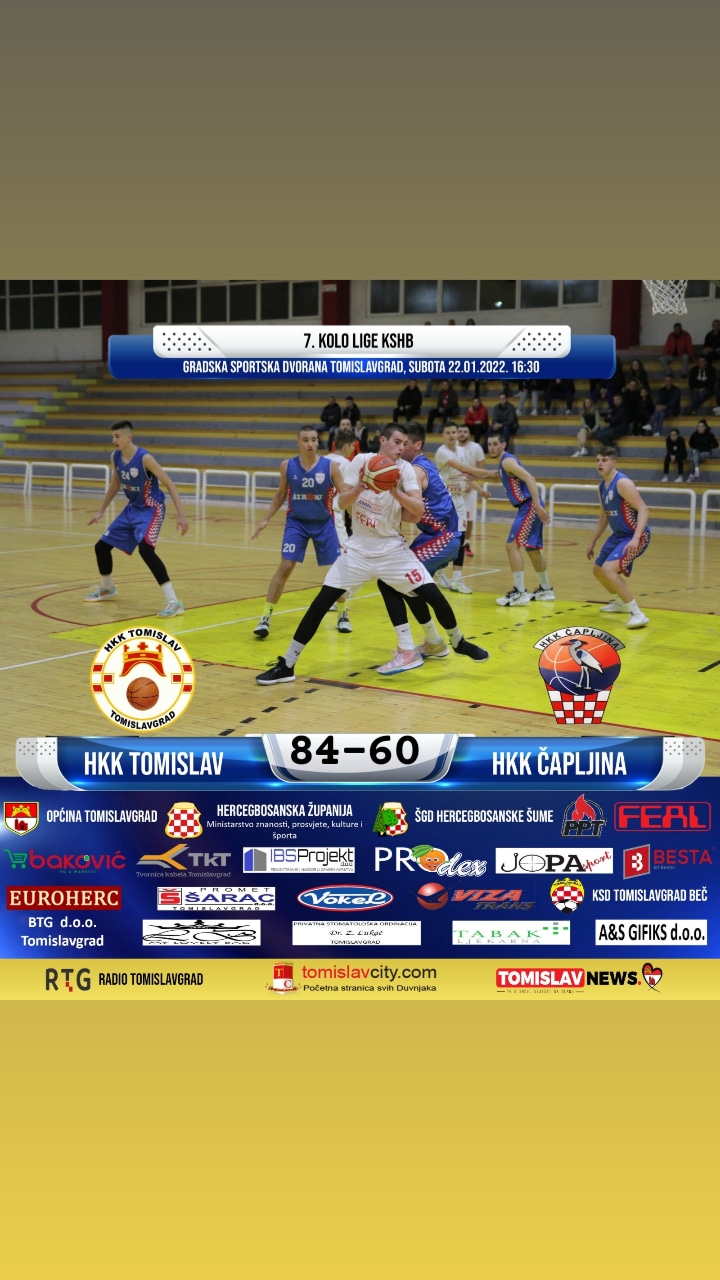 – Naši dečki nakon početnog vodstva, kontroliraju cijelu utakmicu i ne ispuštaju vodstvo koje do kraja utakmice raste na konačni rezultat 84:60. U našim redovima osobito se istaknuo Bože Lučić s 20 poena, 15 skokova, 7 asistencija, te 7 ukradenih lopti. Dvoznamenkasti su još bili Branimir Mašić 17 poena i Ante Sučić sa 10 poena. Svakako ne smijemo zaboraviti doprinos i ostalih igrača, 9 igrača upisalo se u strijelce, a gotovo svi su dobili priliku na ovoj utakmici. Pobjedom u ovoj utakmici zauzeli smo 2. mjesto, dok do završetka regularnog dijela prvenstva ostalo je još 6 kola. Trenutno smo izjednačeni sa vodećom ekipom Gruda, koja je također na omjeru 7 pobjeda i 2 poraza, ali je bolja u međusobnom omjeru od naše momčadi, navode u Tomislavu.
