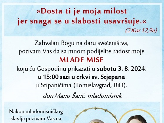 Mlada misa don Maria Šarića, svećenika Zagrebačke nadbiskupije, bit će slavljena sutra u crkvi sv. Stjepana u Stipanićima. Misno slavlje počinje u 15 sati.