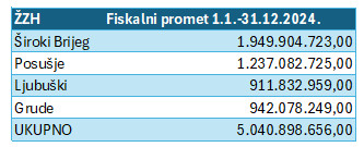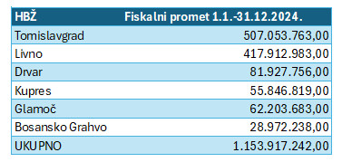 Ako se pogledaju podaci iz Hercegbosanske županije, može se zaključiti da nije bilo bitnijih promjena u odnosu na 2023. godinu. Tomislavgrad je s više od 507 milijuna KM i dalje vodeći po prometu, slijedi Livno s gotovo 418 milijuna KM pa Drvar s gotovo 82 milijuna KM…