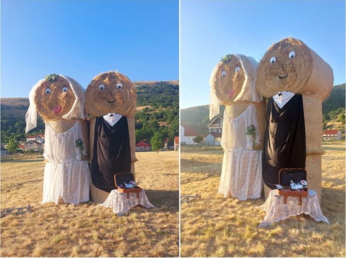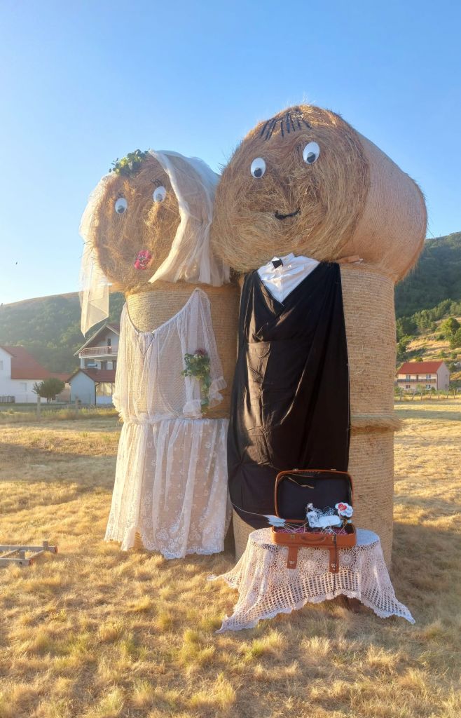 Zanimljivost s njihovoga dana vjenčanja je ova fotografija snimljena kod mladenkine kuće u Crvenicama što govori i o kreativnosti ovih mladih ljudi. Lik mladenaca napravljen je od slame – slamnatih bala koji i ovoga ljeta krase naše Duvanjsko polje. Ispred slamnatih mladenca ja stolić s heklanim stolnjakom i kovčegom (lok. koferom), mogli bismo reći simbolom puta u “bolji život”, kojim su 60-godina prošloga stoljeća krenuli mnogi Crveničani i ostali Duvnjaci, odlazeći na rad u zapadnoeuropske zemlje.