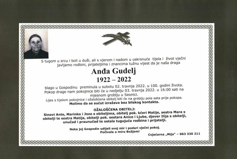 U subotu, 2. travnja u 100. godini života blago u Gospodinu preminula je Anđa Gudelj.
