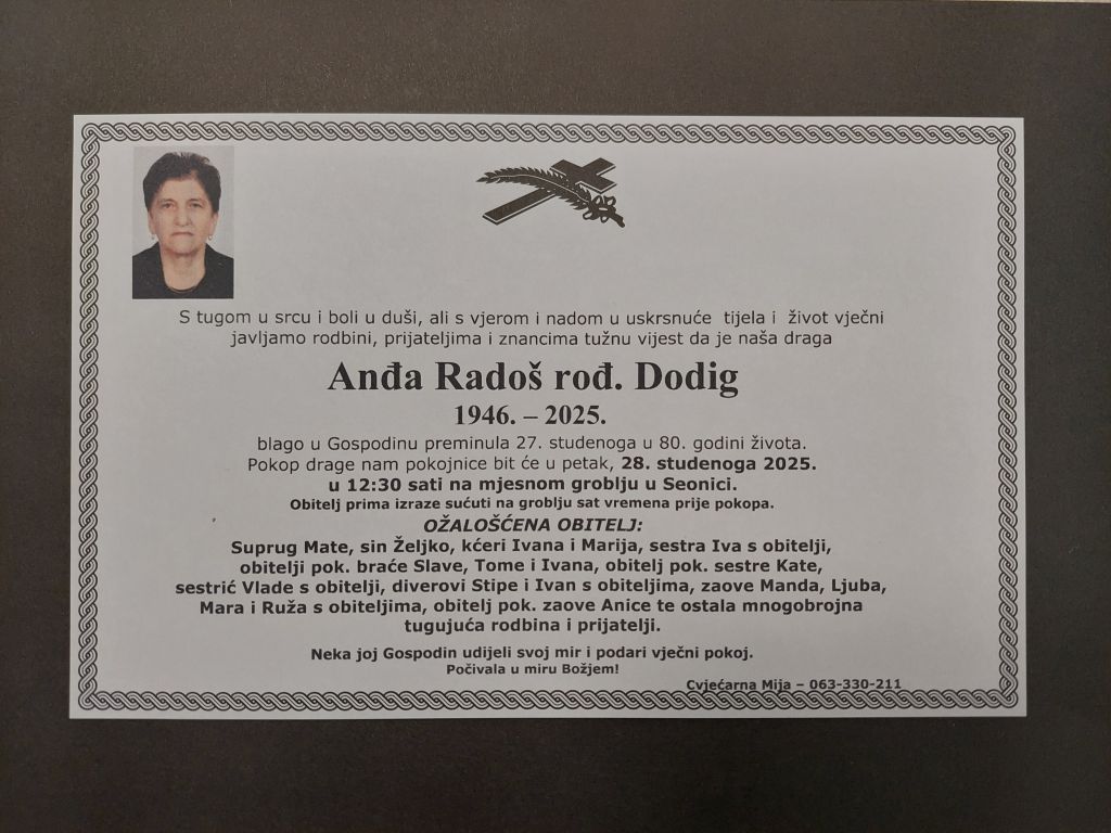 U četvrtak, 27. studenog 2025. godine u 80. godini života blago u Gospodinu preminula je Anđa Radoš rođ. Dodig.