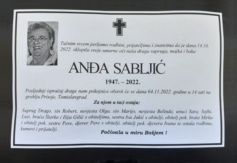 Naslovnica Osmrtnice Posljednji ispraćaj Anđe Sabljić bit će 4. studenog u Prisoju Osmrtnice Posljednji ispraćaj Anđe Sabljić bit će 4. studenog u Prisoju Objavio TCity - 3. studenoga 2022. U petak, 14. listopada 2022. godine blago u Gospodinu preminula je Anđa Sabljić. Posljednji ispraćaj bit će u petak, 4. studenog u 14 sati na mjesnom groblju u Prisoju. Obitelji pokojne Anđe upućujemo iskrenu sućut. Pokoj vječni daruj joj Gospodine, i svjetlost vječna neka joj svijetli! VEZANI ČLANCIVIŠE OD AUTORA Posljednji ispraćaj Slavka Dodiga bit će 16. travnja u Crvenicama Posljednji ispraćaj Ruže Majić bit će 15. travnja u Kongori Posljednji ispraćaj Marka Perića bit će 16. travnja u Zagrebu SKB Mostar: Prvi put u BiH izveden iznimno složen zahvat na... 15. travnja 2026. Objavljeni javni pozivi za razvoj turizma u FBiH 15. travnja 2026. Veliki uspjeh Srednje ekonomske škole Livno: Drugo mjesto na regionalnom programerskom... 15. travnja 2026. Krtice mrze kad im ovo stavite u rupu: ‘Bježe odmah čim... 15. travnja 2026. FBiH: Više umrlih nego rođenih u svih deset županija 15. travnja 2026.