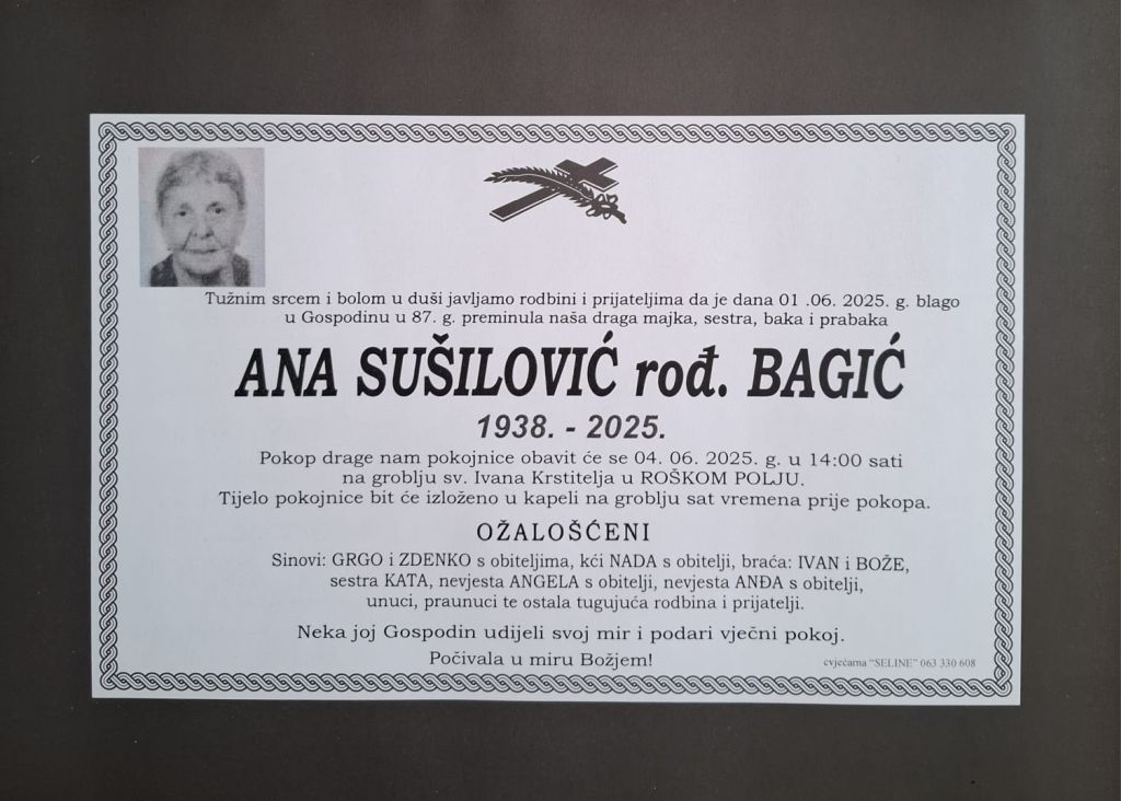 U nedjelju, 1. lipnja 2025. u 87. godini života blago u Gospodinu preminula je Ana Sušilović rođ. Bagić.