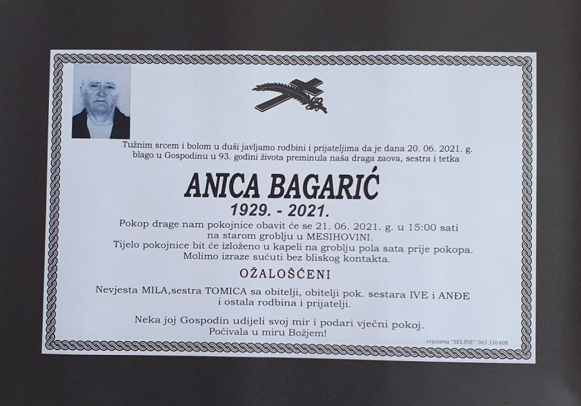 U nedjelju, 20. lipnja, u 93. godini života blago u Gospodinu preminula je Anica Bagarić.