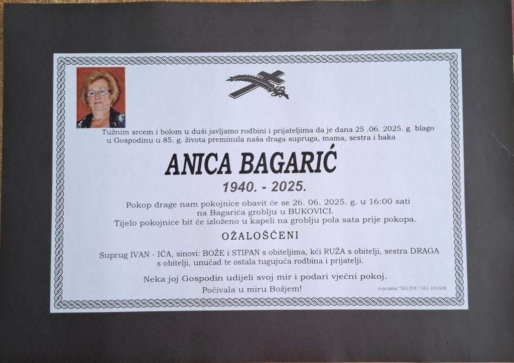 U srijedu, 25. lipnja 2025. godine u 85. godini života, blago u Gospodinu, preminula je Anica Bagarić.