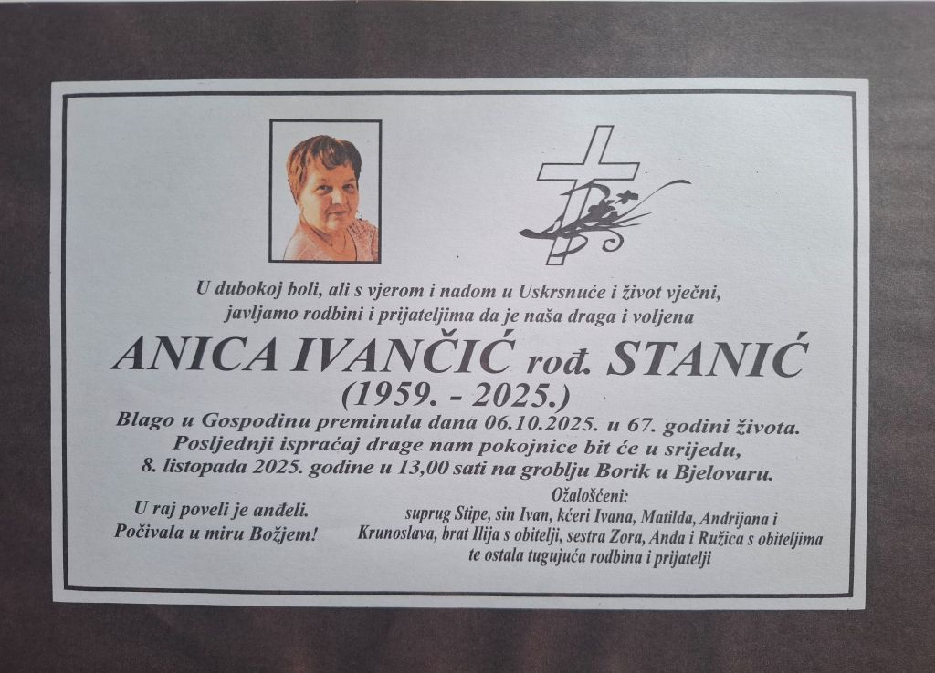 U ponedjeljak, 6. listopada 2025. u 67. godini života blago u Gospodinu preminula je Anica Ivančić rođ. Stanić.