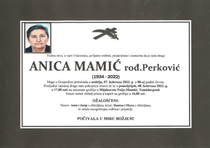 U nedjelju, 7. kolovoza u 88. godini života blago u Gospodinu preminula je Anica Mamić rođ. Perković.
