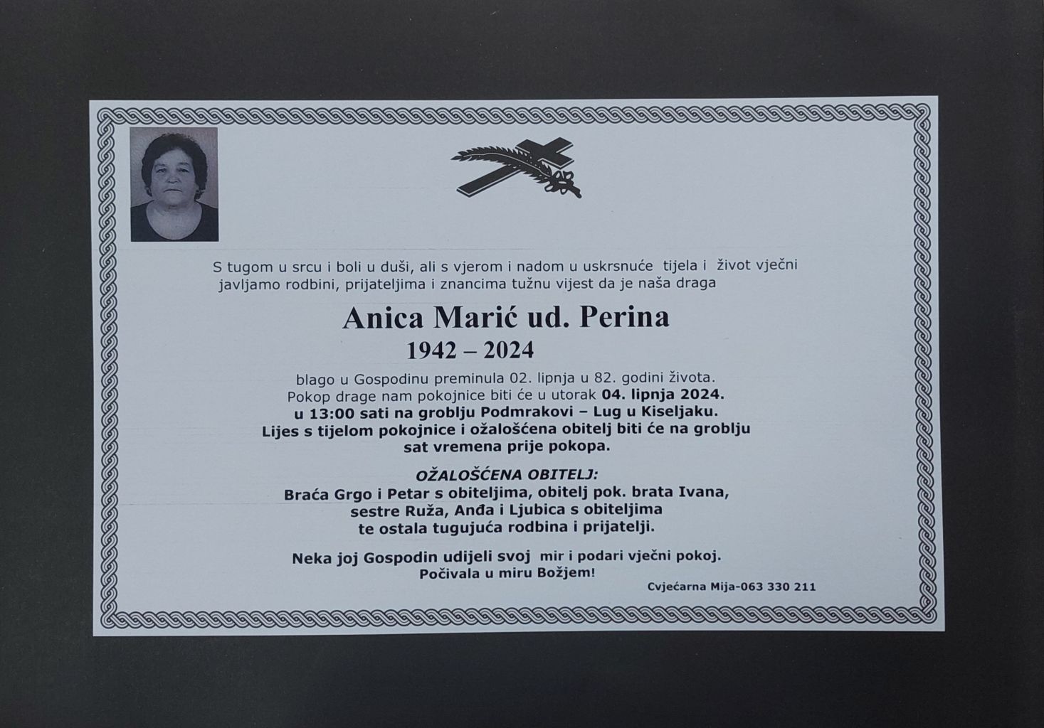 U nedjelju, 2. lipnja 2024. godine u 82. godini života blago u Gospodinu preminula je Anica Marić. ud. Perina.