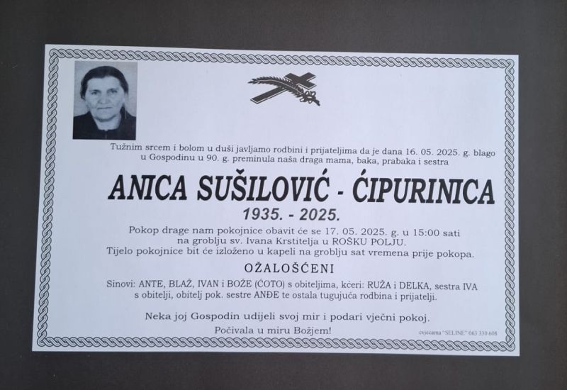 U petak, 16. svibnja 2025. u 90. godini života blago u Gospodinu preminula je Anica Sušilović – Ćipurinica.